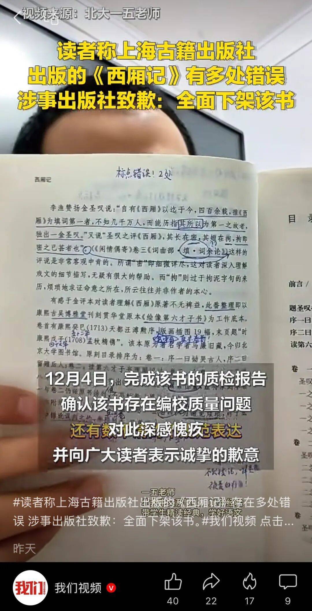 教育博主“一五老师”发文批评上海古籍出版社出版的《西厢记》一书。图/我们视频